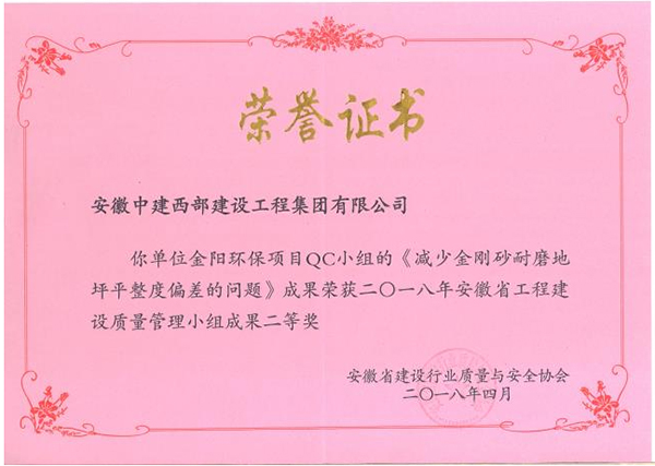 2018年度QC成果榮獲安徽省建筑業(yè)優(yōu)秀質(zhì)量管理獎(jiǎng)項(xiàng)