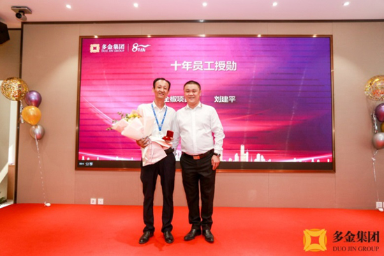 企業成長發展離不開一群堅守崗位、默默奮斗的人,他們與多金風雨同舟,感恩同行。在今天這個特別的日子里,多金為五年和十年老員工進行“授勛”。 12名五年司齡和1名10年司齡的老員工分別被授予銀質和金質司徽,這一枚枚象征榮譽的特殊司徽鐫刻著老員工的奉獻與忠誠,見證所有老員工在多金的成長與發展、責任與擔當!