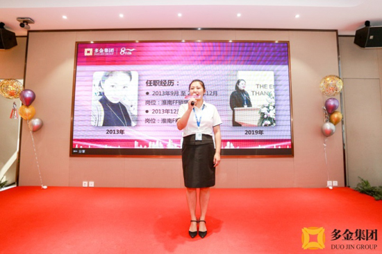 五年員工何培蕾作為授勛員工代表發言,她用自己和團隊的案例講述了自己如何從職場新人成長為獨當一面的店長、團隊如何頂住壓力提升業績……,何培蕾只是眾多多金老員工的一個縮影,她的分享向我們解讀了什么是“唯有奮斗,才能成功”。