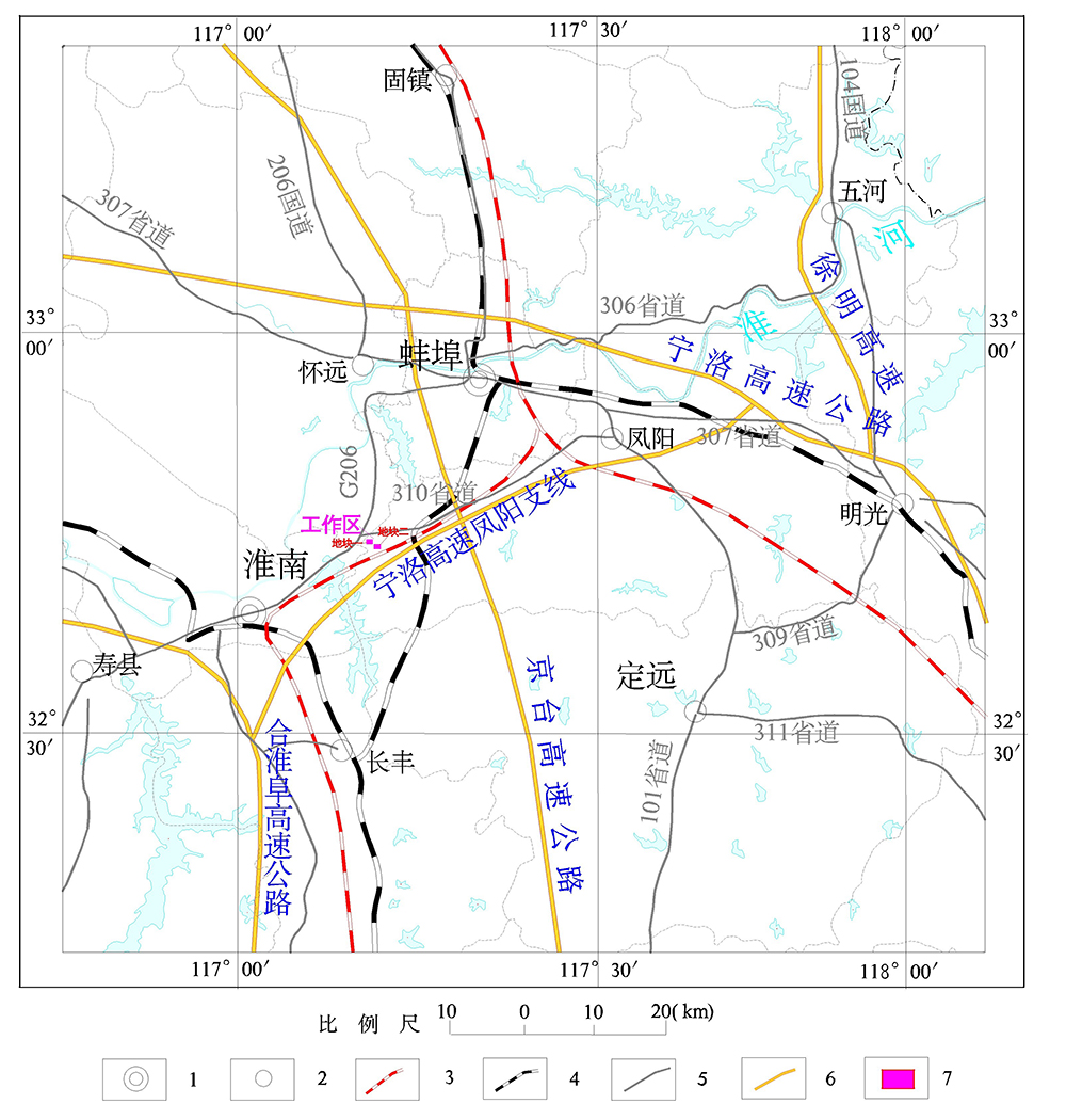 工作區鐵路、公路交通便利,工作區南側有合蚌客運專線(高鐵)與寧洛高速鳳陽支線通過,東緣有京臺高速公路通過,區內有簡易公路連接鳳(陽)~淮(南)(310省道)與國道206主干公路。(圖1-1)