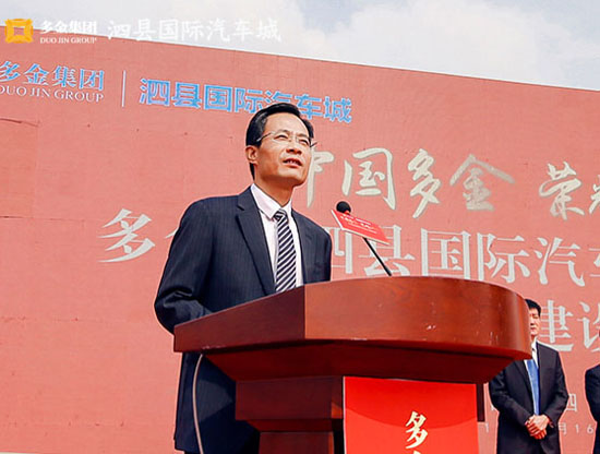 泗縣縣委常委、縣政府副縣長劉紹云同志首先上臺致辭。劉紹云同志在致辭中指出,當前泗縣已全面進入后發趕超、加速崛起的沖刺時期,迫切需要進一步拓展發展空間,增強城市承載能力,并且高度肯定了多金集團的實力和在區域內的發展優勢,并祝愿“多金· 泗縣國際汽車城項目奠基儀式圓滿成功”。
