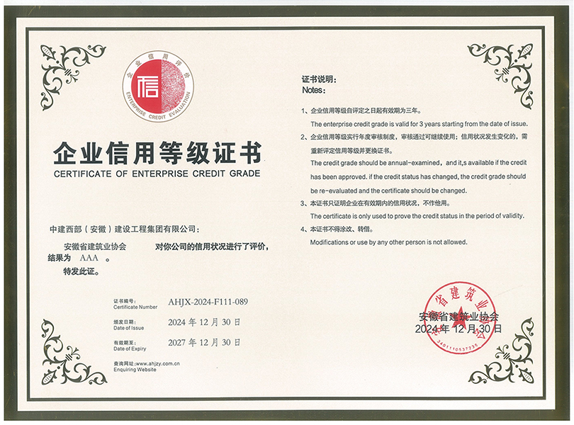 近日,中建西部(安徽)建設工程集團有限公司憑借卓越的企業信用表現,榮獲安徽省建筑業協會頒發的“企業信用評級AAA級信用企業”證書。該榮譽是安徽省建筑業信用評價體系的最高等級認證,標志著公司在誠信體系建設、合規經營及社會責任履行等方面獲得行業權威認可,為企業高質量發展再添“金字招牌”。